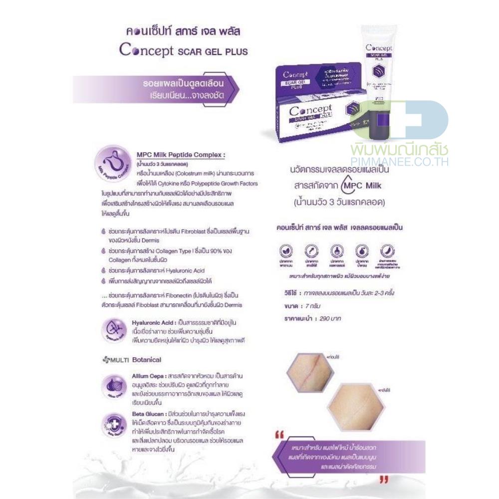 เจล รอยแผลเป็น Concept Scar Gel Plus คอนเซ็ปท์ สการ์ เจล พลัส [7 กรัม] น้ำนมวัว 3 วันแรกคลอด หรือน้ำนมถั่วเหลือง ผ่านกระบวนการเพื่อให้ได้รูปแบบสามารถทำงานกับเซลล์ผิวได้ดี เพื่อเสริมสร้างโครงสร้างผิวให้แข็งแรง สมานลดเลือนรอยแผลให้แลดูตื้นขึ้น เพิ่มการส่งสัญญาณจากเซลล์ผิวถึงเซลล์ผิวได้